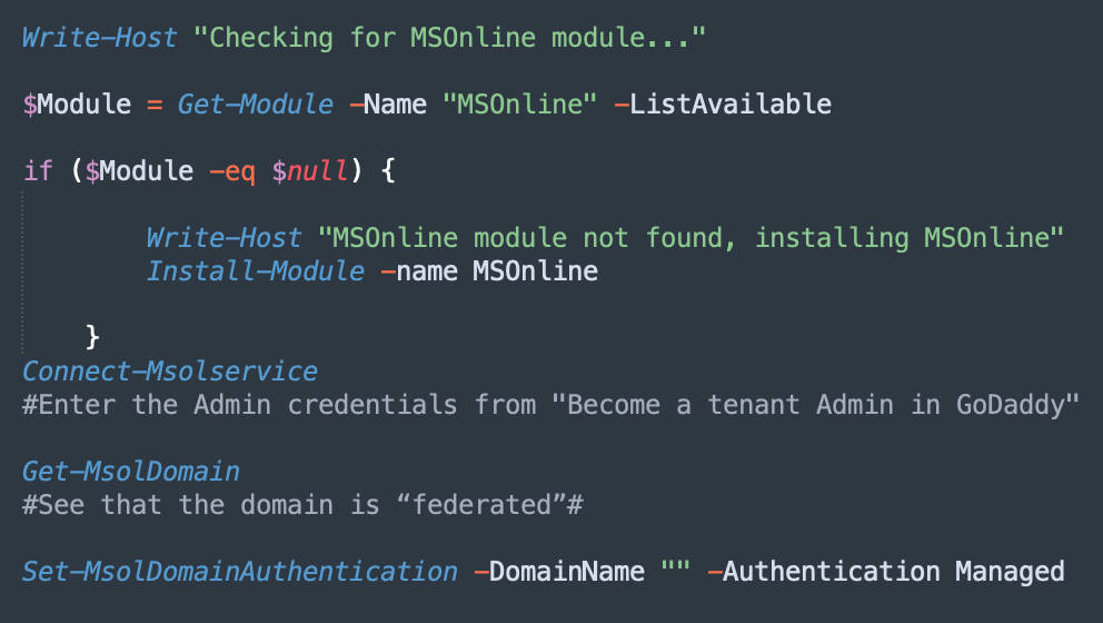 When a user sets up a 365 account directly with GoDaddy, they set up the initial user as an “admin” user but this user is redirected to the GoDaddy portal when trying to access the admin tab when going to Office.com. For this reason, we need to gain access to the true Global Admin so that we can perform the necessary PowerShell scripts to defederate the tenant.