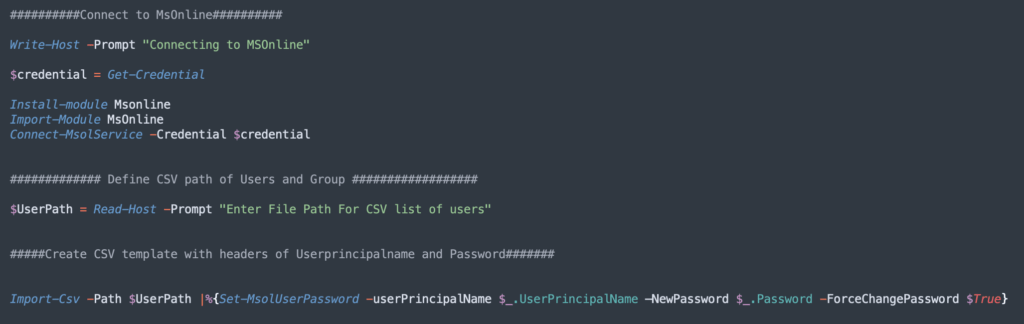 You can do this manually one user at a time if there aren’t many users in the account or you could use a powershell script to bulk update everyone passwords form a CSV file. If you plan to do them manually, then you can simply login to office.com as the admin we derived from section B and now that the tenant is defederated, you will be able to click into the admin tile and access the Users section like you are familiar with. Otherwise, you can connect to Powershell as administrator and run the powershell script below: