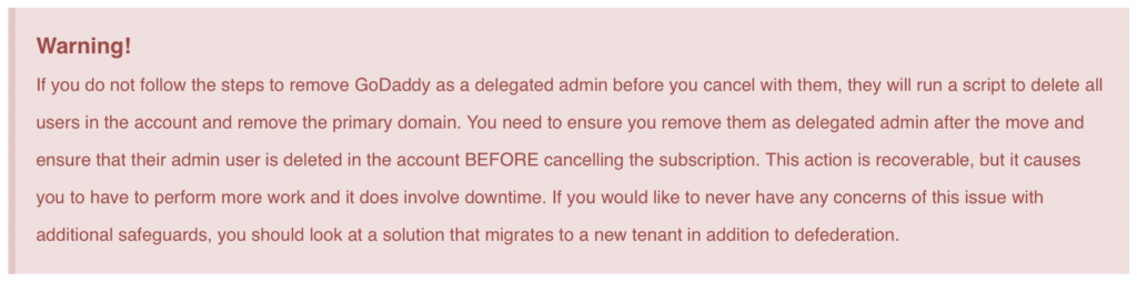 Customers can purchase a Microsoft 365 subscription direct with GoDaddy along with their primary domain. When this occurs, GoDaddy federates this domain and tenant, making it unable to transfer under the CSP program. Moving and defederating this account has been a major pain point and it has often involved talking to GoDaddy support for many hours. In calling them to defederate the domain, they would delete all user accounts and data, so you had to make sure you had migrated the email to a new 365 tenant first before performing this cutover. Once they released the domain, it was often a scramble to get this set back up in the new 365 tenant to avoid downtime as much as possible.