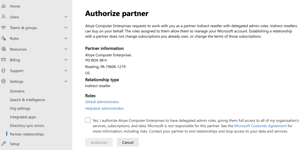 Once you sign and submit the DocuSign Contract, the next step is to officially accept Aloye Computer Enterprises LLC as your Microsoft Partner of Record and Delegated Administrative and Billing Partner.