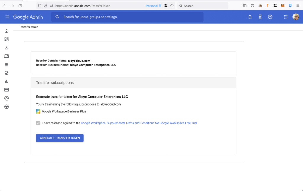 After clicking "Confirm Reseller Identifier", you will be taken to the following page where you will need to check the acceptance box and click the button to generate the transfer token as shown below