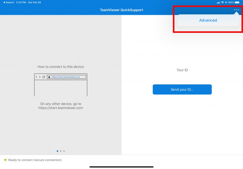 - Launch TeamViewer QS and click the three dots in the upper right corner, then click Advanced as circled in red in the image below.