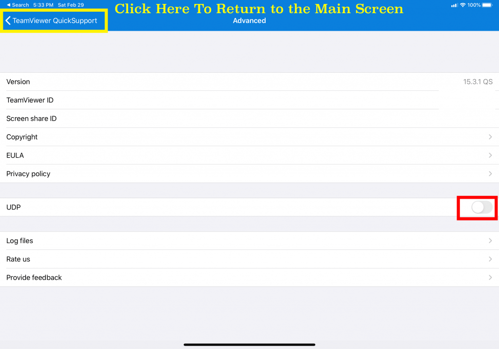 - Then click the yellow circled TeamViewer Quick Support Arrow to return to the main screen as shown below