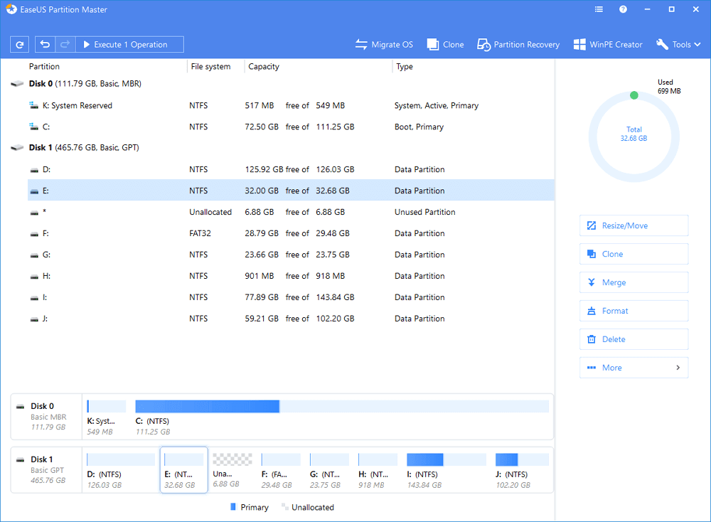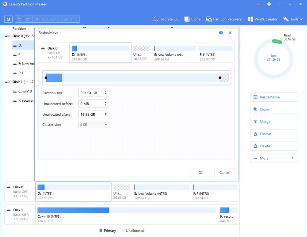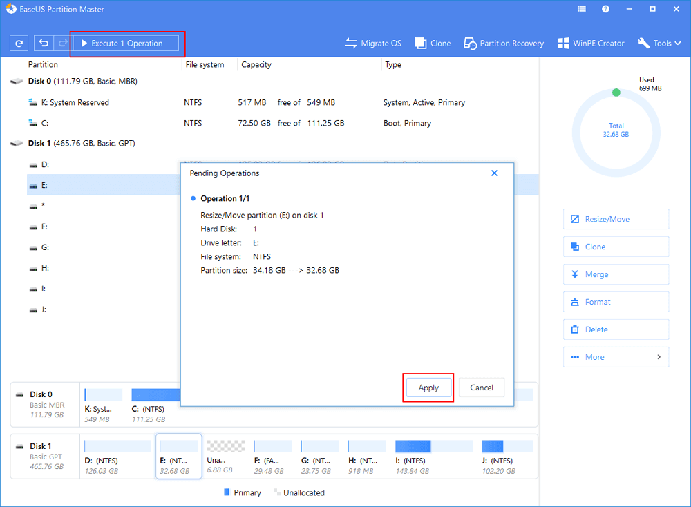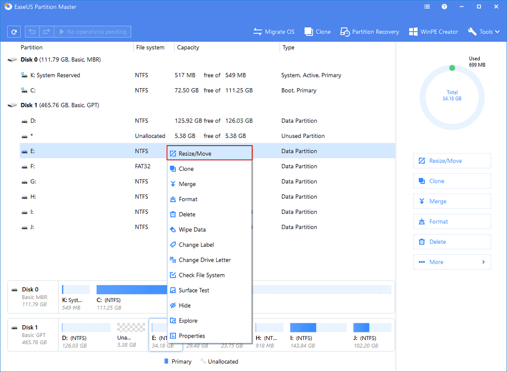 • Which drive/partition do you want to adjust its size? Right-click on it and choose "Resize/Move".