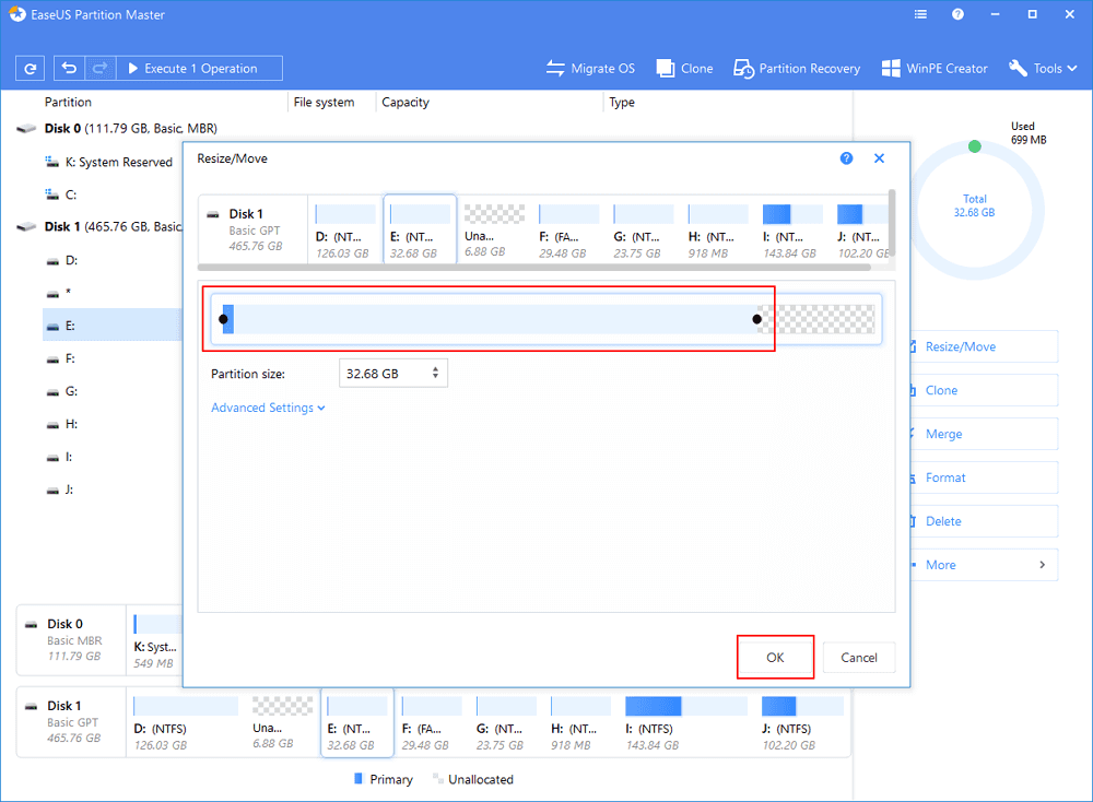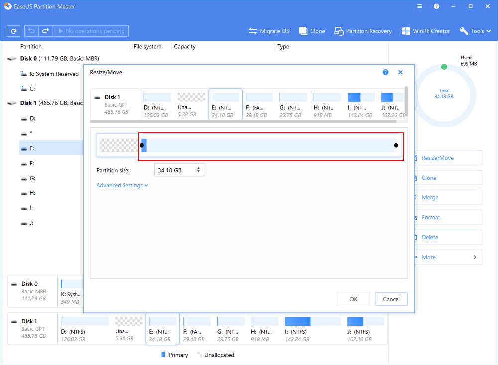 To shrink the partition, simply use your mouse to drag one of its ends into unallocated space. Expand the "Advanced Settings" list, where you can see the exact disk space for each partition. Once done, click "OK".