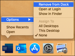 - If you put any of the Office applications in your Dock, go to each one and ctrl + click > Options > Remove from Dock.